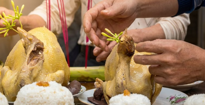 祭祖·无鸡不成席。9时起,八仙桌摆院中。正中一只最肥的熟阉鸡(完整未切),旁列咸鱼对、红蛋、饭团。长者奠酒祷祝,焚香烧纸,点爆竹。文昌人认为鸡爪往后刨,用鸡祭祖可“刨财益后”。除夕夜不眠,零时按通书吉方“迎春接福”,争燃“万三三”喜炮(“多多”之意),炮仗越响、越长,寓意当年盈利越丰。