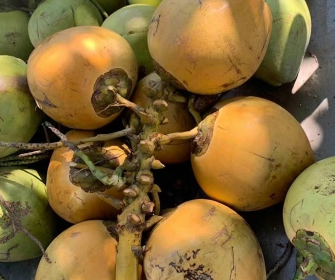在东郊,如果你让阿婆给你挑一个最甜的,她大概率不会给你那种个头巨大的青椰(高种椰子),而是会递给你一个个头稍小、表皮泛着红褐色的“红椰”(本地人常叫“金椰”或矮种红椰)。